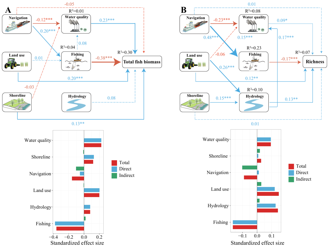 在全面禁渔,长江流域的渔业捕捞压力完全消除,航运、岸带开发利用等压力减少,水质得到了提升。结合广义最小二乘法和分段结构方程模型,研究进一步确证了全面禁渔是驱动长江鱼类资源初期恢复的主要直接的因素,其他压力因子的缓解及水质的提升起到了协同贡献作用(图3)。